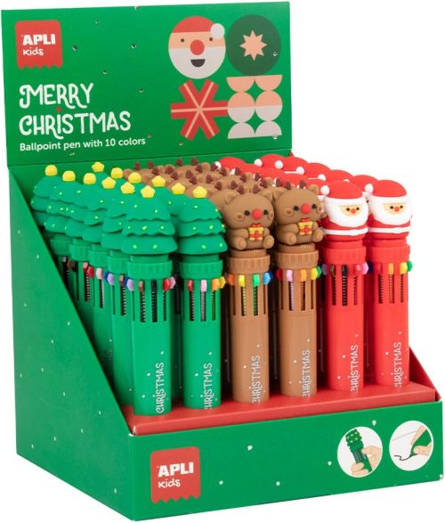 Descubre la magia de la Navidad en cada trazo con los nuevos bolígrafos de 10 tintas! Con diseños navideños llenos de color, son perfectos para escribir, dibujar, decorar o regalar durante las fiestas. Cada bolígrafo incluye 10 colores distintos en un solo cuerpo, ideales para dar rienda suelta a la creatividad con un toque festivo. El expositor contiene 36 bolígrafos de 10 tintas en 3 modelos surtidos: Árbol de Navidad, Reno y Papá Noel.