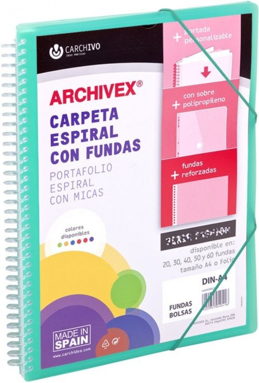 Carpeta de espiral indeformable que contiene 60 fundas de polipropileno tamaño A4 con refuerzo;la portada es tipo canguro para personalizar, incluye sobre en la parte posterior y cierre de goma.