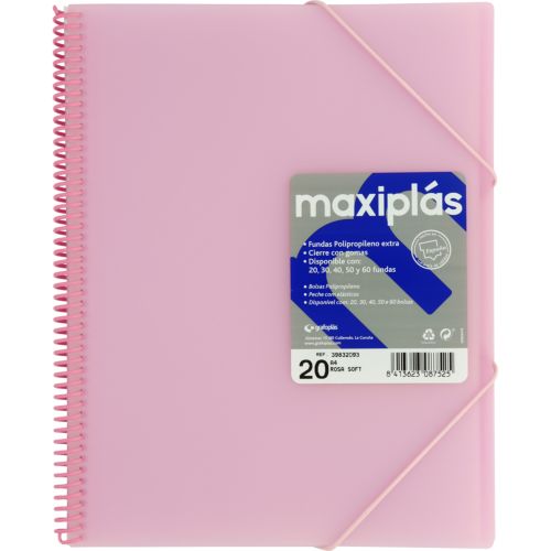 Cubiertas en polipropileno rígido translúcido. Mecanismo de espiral en PVC. Cierre con gomas elásticas. Contienen fundas taladradas de polipropileno extra. Incluyen un sobre con cierre de cinta adhesiva textil.