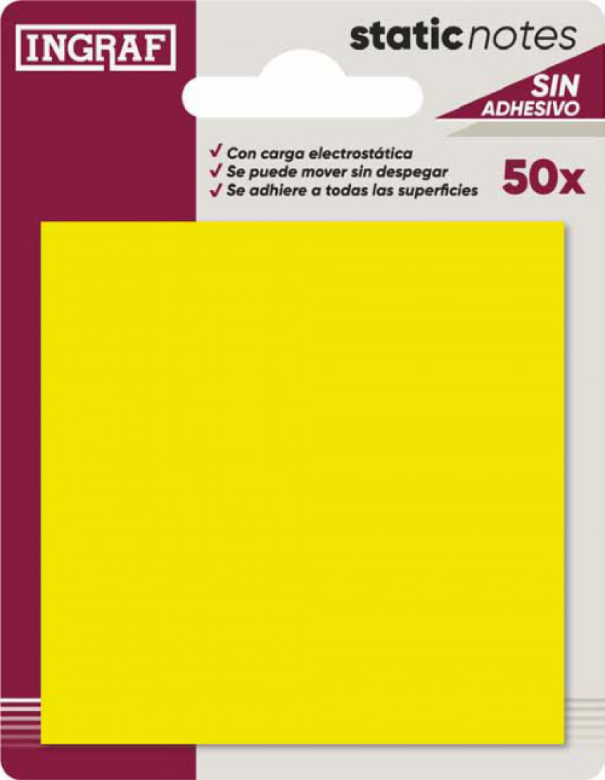 Notas de papel con carga electroestatica sin adhesivo. Se pueden mover sin despeger. Se adhiere a todas las superficies. Tamaxo 76x76mm. Tacos de 50 uds. 4 colores surtidos, usalas en cuadernos agendas libretas o pizarras.